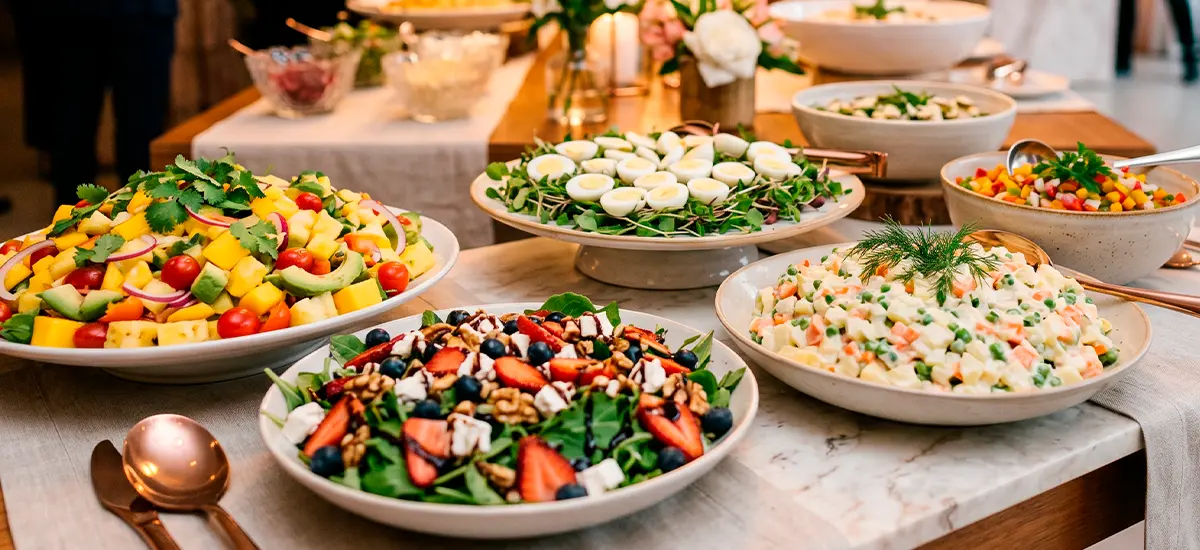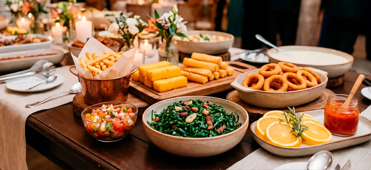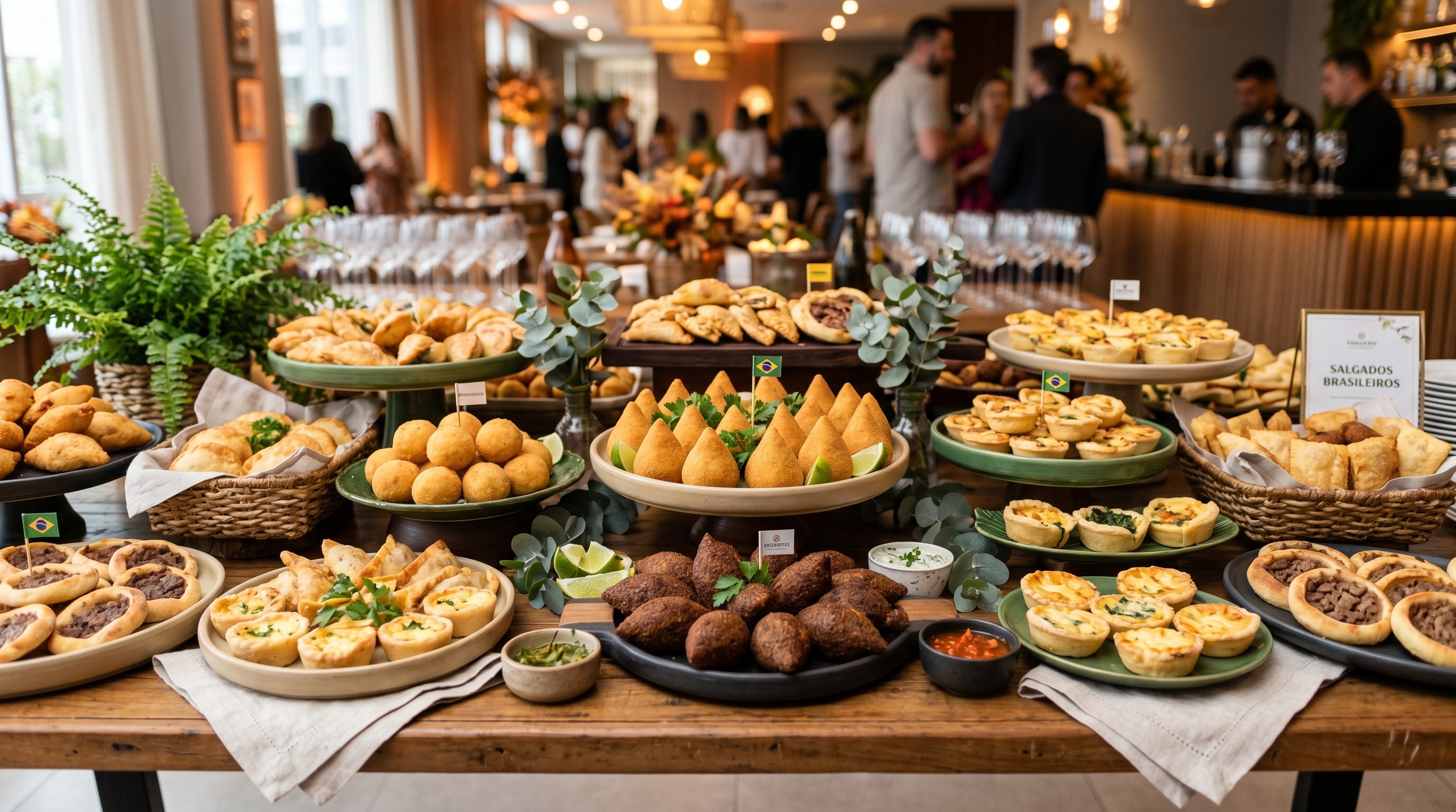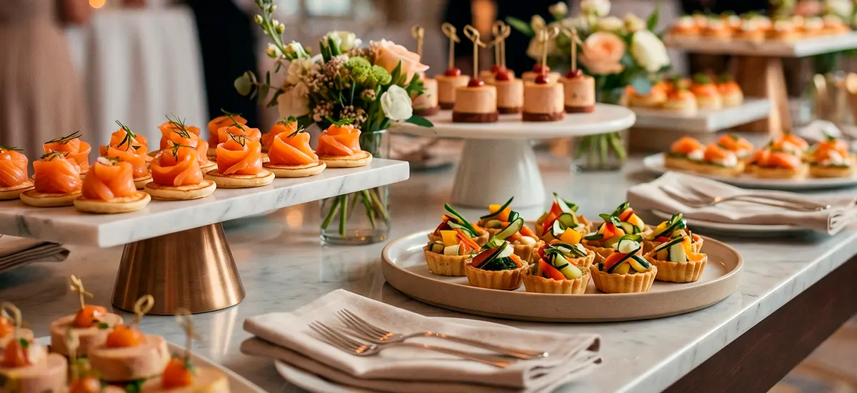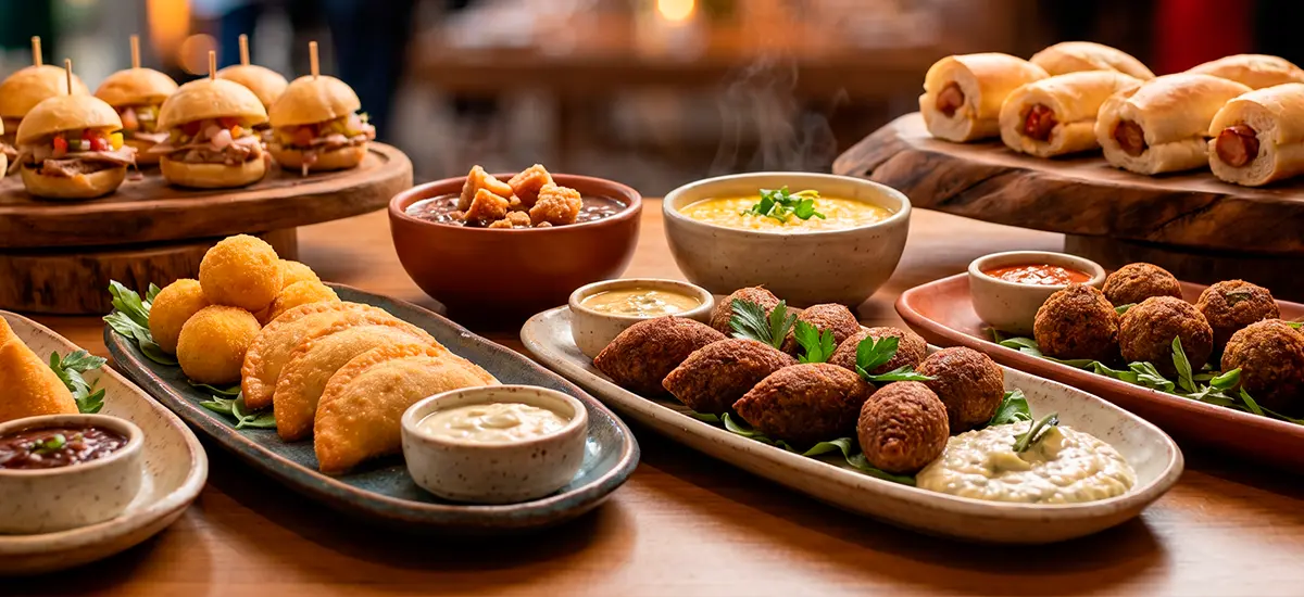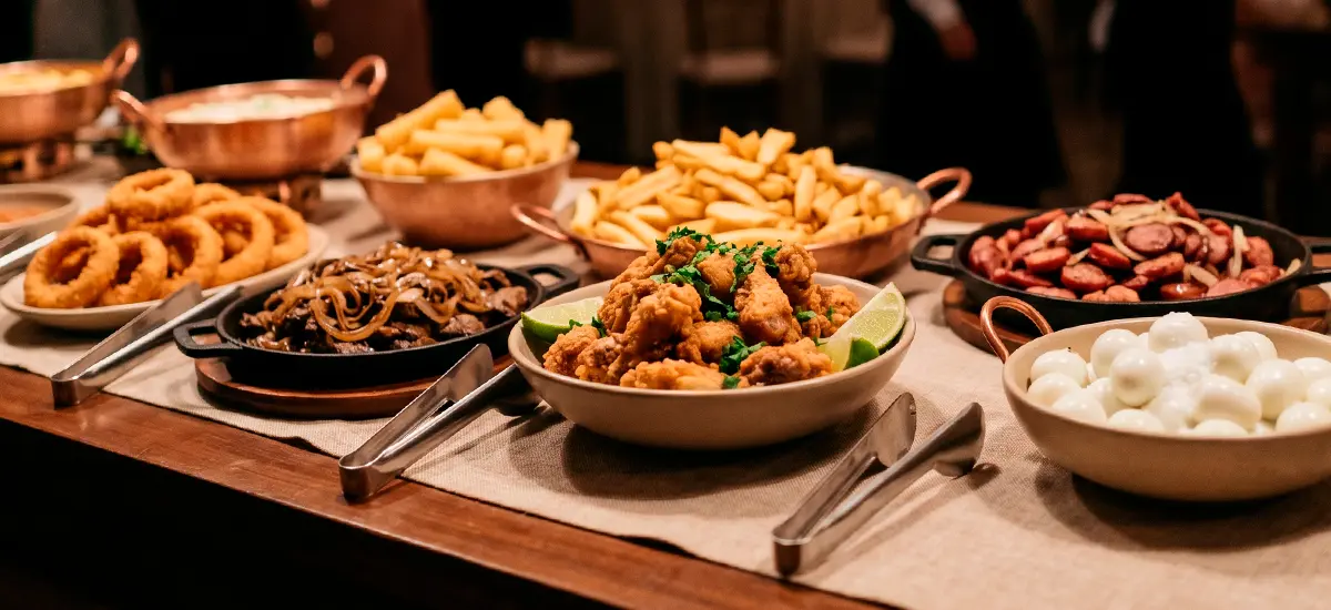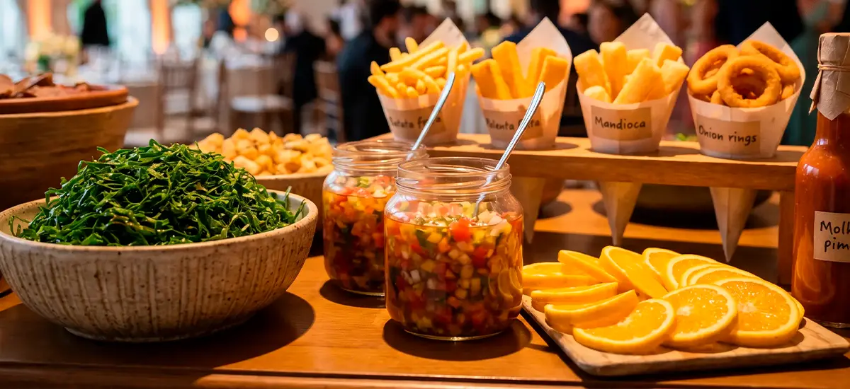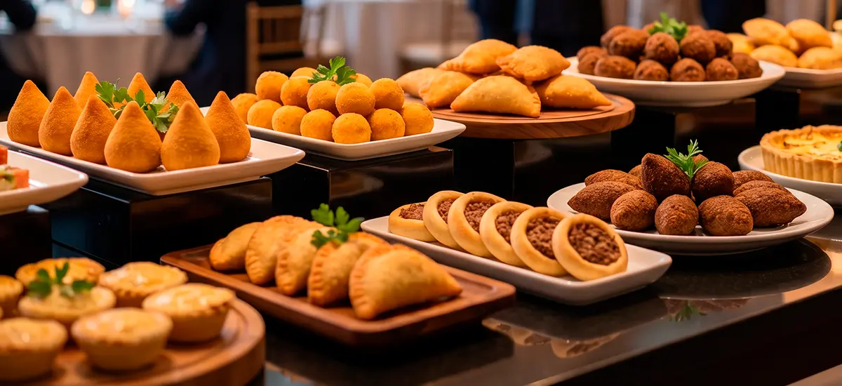 Coquetel salgado refinado, com opções leves e bem elaboradas, perfeito para recepções elegantes e dinâmicas